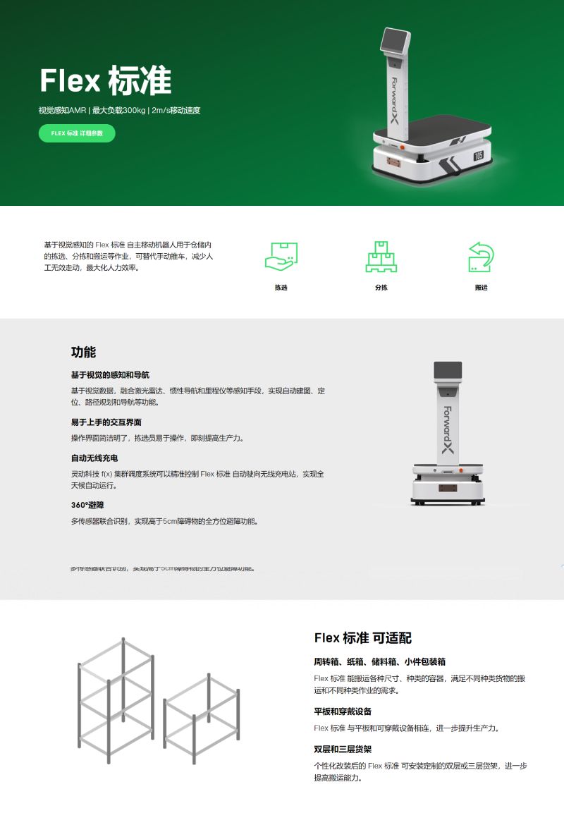 基于視覺(jué)感知的 Flex 標(biāo)準(zhǔn) 自主移動(dòng)機(jī)器人用于倉(cāng)儲(chǔ)內(nèi)的揀選、分揀和搬運(yùn)等作業(yè),可替代手動(dòng)推車(chē),減少人工無(wú)效走動(dòng),最大化人力效率。