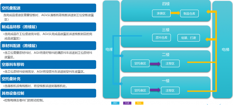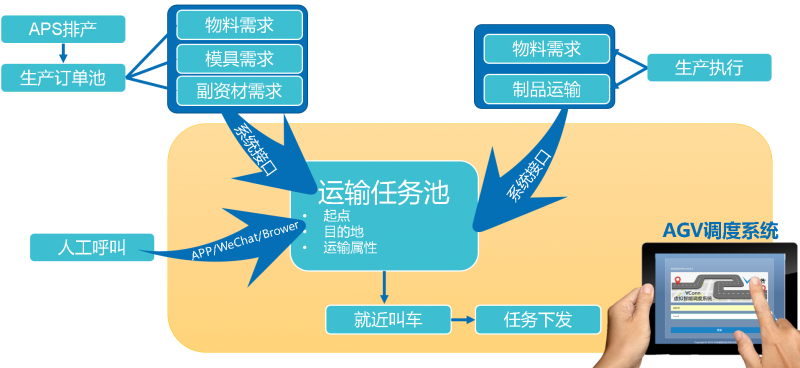 AGV調度系統(VConn)完成物料計劃下發,現場叫料之間的系統閉環,考慮到異常送料需求,系統保留人工呼叫接口,可以快速與第三方系統或設備對接
