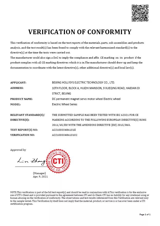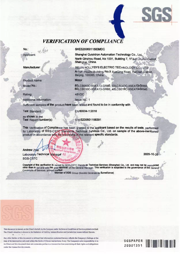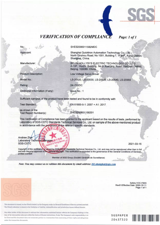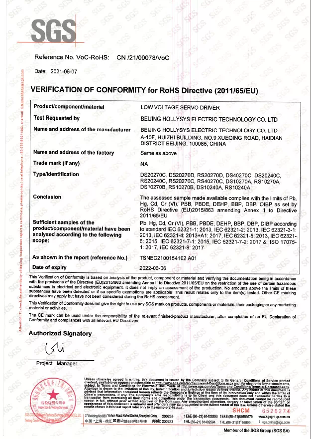 SGS是全球領先的檢驗、鑒定、測試和認證機構,是全球公認的質量和誠信基準。SGS作為國際權威認證機構為和利時電機產品頒發CE證書和RoHS證書,是對和利時電機技術實力的專業背書,增強了和利時電機產品在國際市場的品牌力,也助力設備制造商加速全球化步伐。