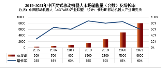 據中國移動機器人(AGV/AMR)產業聯盟數據、新戰略移動機器人產業研究所統計,2021年中國叉式移動機器人(含視覺導航)銷量達8000臺,同比增長60%,市場規模約為24.5億元,同比增長42.40%。