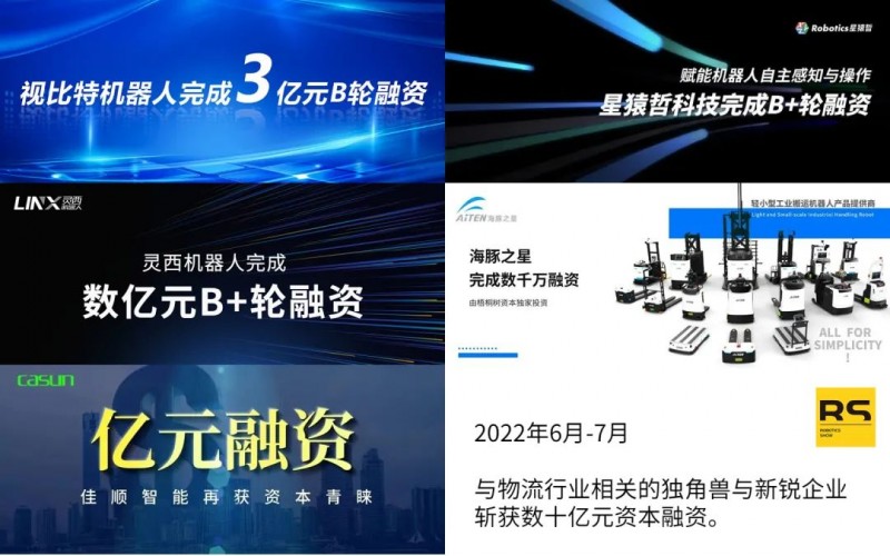 敏銳的資本最先觀察到這波新的移動機器人(AGV/AMR)與物流相關機器人爆發苗頭。據不完全統計,就2022年6月與7月間,與物流行業相關的獨角獸與新銳企業斬獲數十億元資本融資:視比特(展位號:8.1H C198)完成3億元B輪融資,星猿哲科技(展位號:7.1H E230)完成融資金額約4000萬美元的B+輪融資,靈西機器人(展位號:8.1H C062)完成數億元B+輪融資,佳順智能(展位號:7.1H D125)再獲近億元人民幣的融資,海豚之星(展位號:7.1H E175)宣布完成數千萬元融資......均是千萬級以上投資。