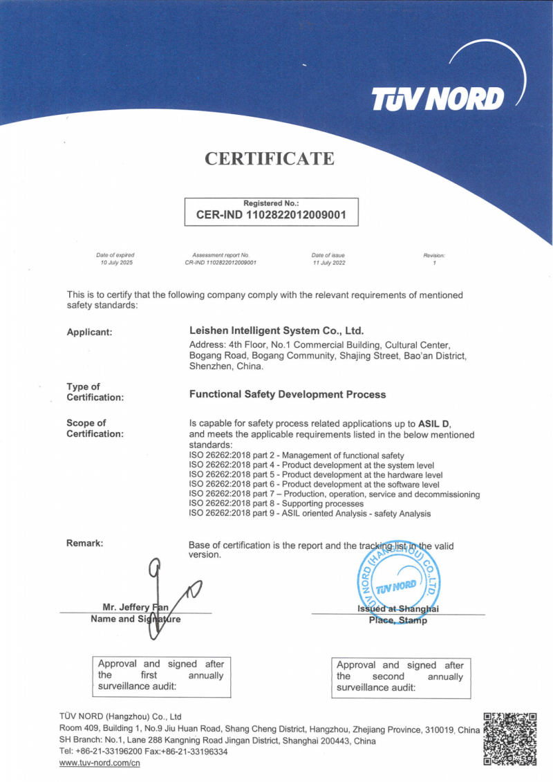 核心提示:7月14日,鐳神智能獲得由TüV NORD 頒發(fā)的ISO 26262:2018汽車功能安全流程認(rèn)證證書,且獲得ASIL D最高等級(jí)認(rèn)可?。ˋSIL有四個(gè)等級(jí),分別為A、B、C、D,其中 D是要求最嚴(yán)苛的等級(jí))。