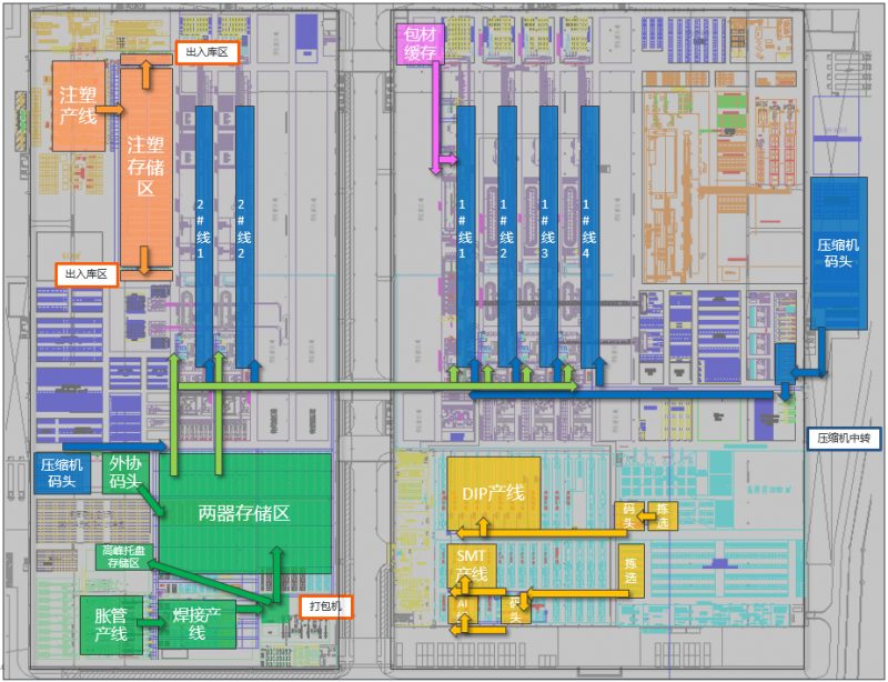 實現二器、注塑、電子、組裝等多個區域AMR自動化轉運,實現柔性、跨多區域靈活、智能轉運;