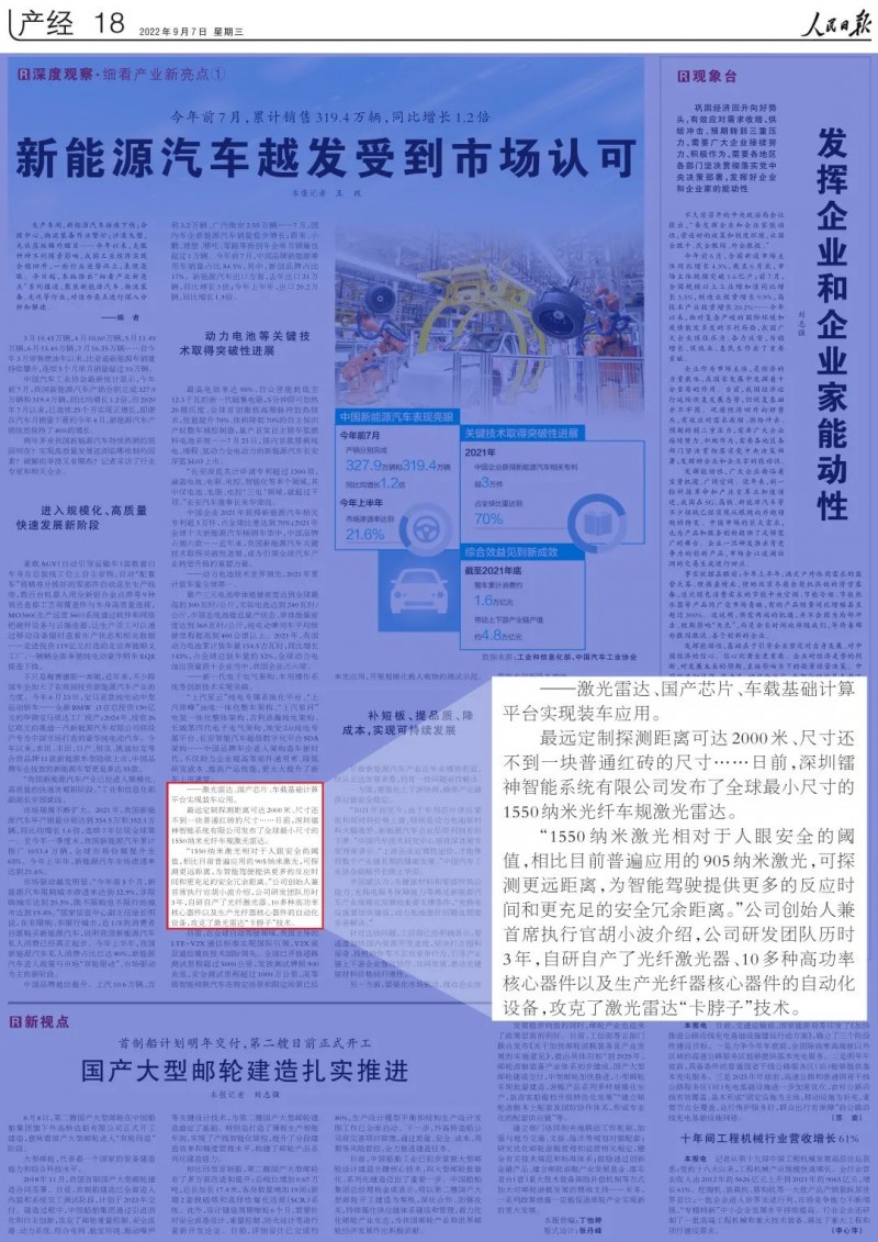 2022年9月7日,人民日報刊登了一篇名為《新能源汽車越發受到市場認可》的文章,其中介紹了鐳神智能創始人胡小波帶領團隊攻克了我國被“卡脖子”的激光雷達技術問題。
