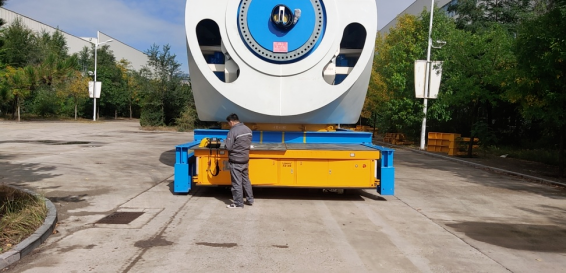 在搬運環節中,航天智造為浙江運達風電,研制的200噸全向舵輪AGV,載重量大,轉向靈活且可以全向移動不傷地面,定位精度高,操控方便,滿足客戶大型風電的運載要求。