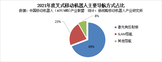 從產(chǎn)品類別分布看,2021年,激光有反射板叉車依舊是市場(chǎng)應(yīng)用主流,占比為69%,其次是SLAM導(dǎo)航無(wú)人叉車,在一些對(duì)機(jī)器人柔性化程度要求高的場(chǎng)景中逐漸滲透,占比為23%。