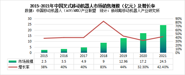 圖表:2015-2021年中國(guó)叉式移動(dòng)機(jī)器人市場(chǎng)銷售規(guī)模(億元)及增長(zhǎng)率