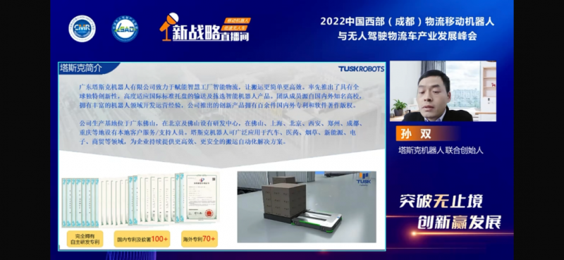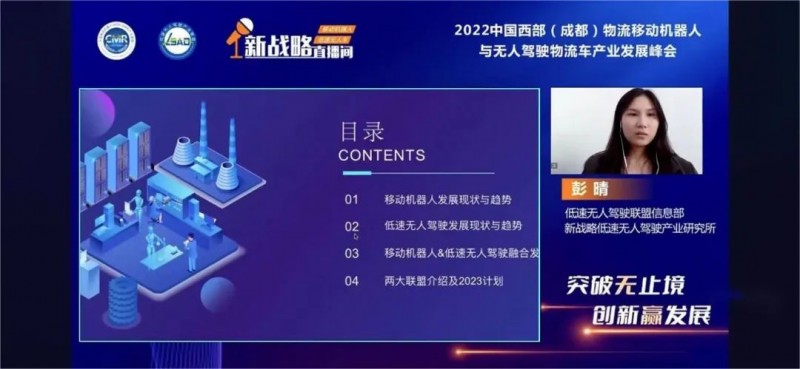 11月23日,由中國(guó)移動(dòng)機(jī)器人(AGV/AMR)產(chǎn)業(yè)聯(lián)盟、低速無(wú)人駕駛產(chǎn)業(yè)聯(lián)盟、《物流搬運(yùn)機(jī)器人》雜志社、《低速無(wú)人車》雜志社、成都北辰中金展覽有限公司聯(lián)合主辦,新戰(zhàn)略移動(dòng)機(jī)器人全媒體、 新戰(zhàn)略低速無(wú)人駕駛?cè)襟w協(xié)辦的2022中國(guó)西部(成都)物流移動(dòng)機(jī)器人與無(wú)人駕駛物流車發(fā)展峰會(huì)在線上成功舉行!