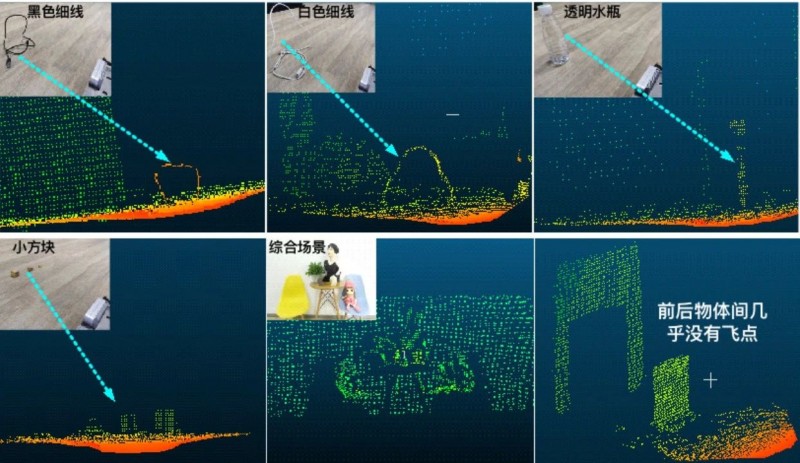 實(shí)拍場(chǎng)景與3D點(diǎn)云,可以看到dToF不僅在綜合場(chǎng)景中表現(xiàn)優(yōu)秀,對(duì)小物體,細(xì)線甚至透明物體等極端場(chǎng)景都有非常好的表現(xiàn),并且相對(duì)于其他ToF技術(shù),dToF在飛點(diǎn)(前后物體邊界難以區(qū)分造成的)的表現(xiàn)上有天然優(yōu)勢(shì)。![]()