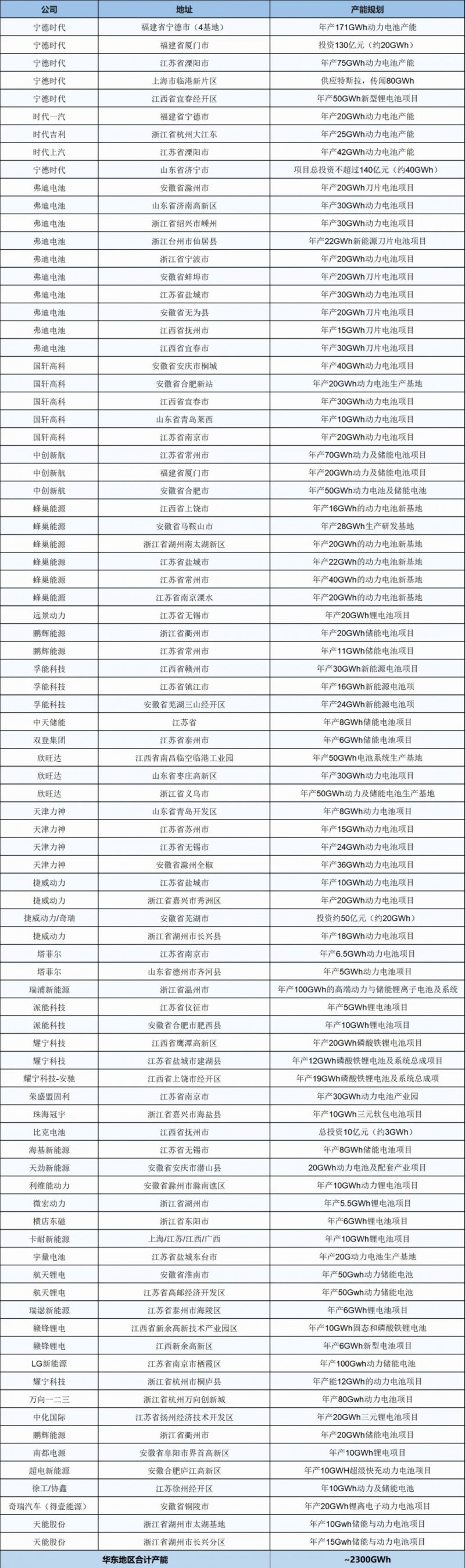 全國動(dòng)力與儲(chǔ)能電池基地產(chǎn)能統(tǒng)計(jì)表1---華東地區(qū)