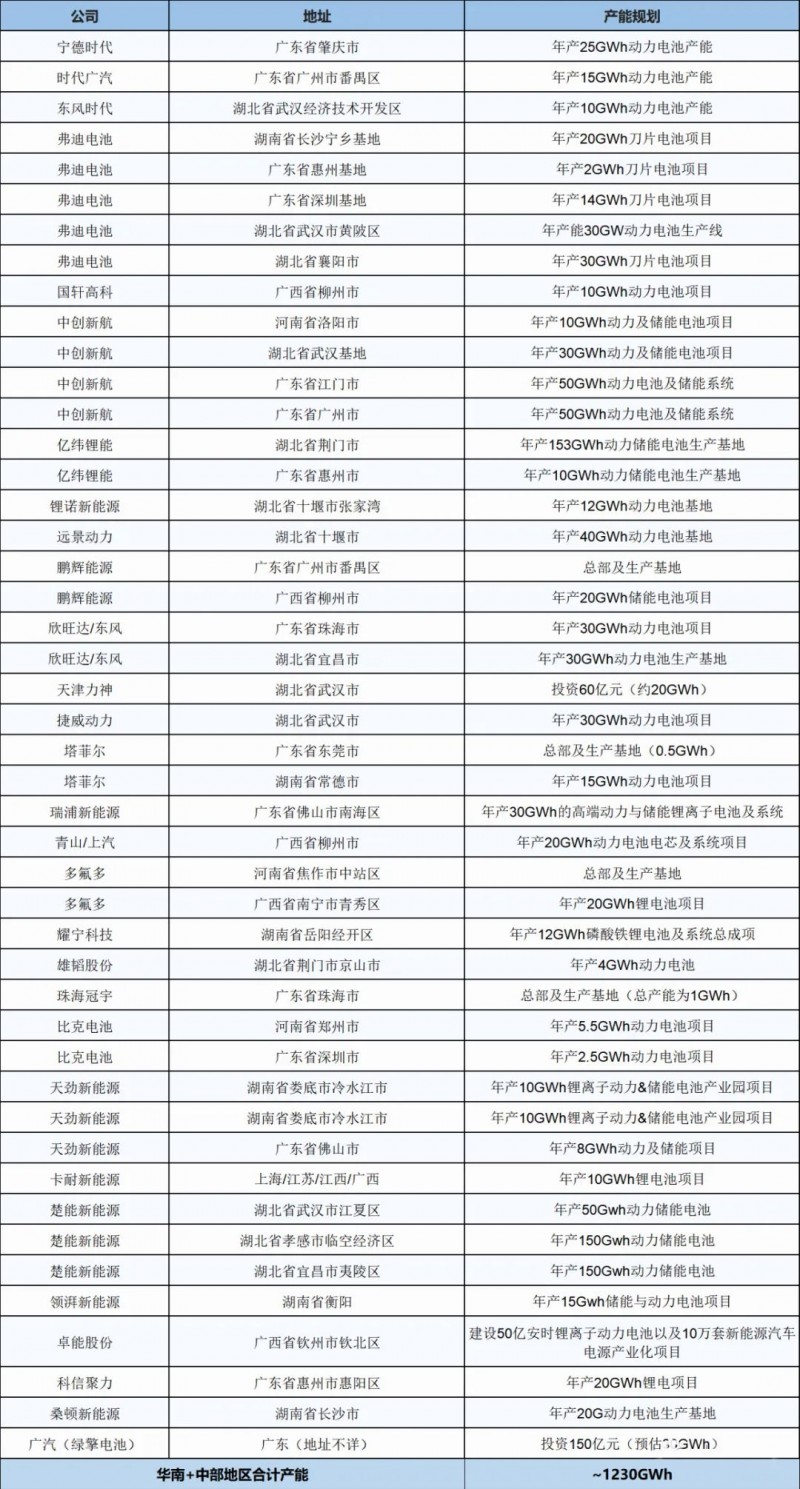 全國動(dòng)力與儲(chǔ)能電池基地產(chǎn)能統(tǒng)計(jì)表3---華南+中部地區(qū)