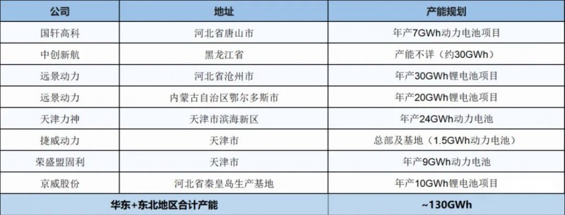 全國動(dòng)力與儲(chǔ)能電池基地產(chǎn)能統(tǒng)計(jì)表2---華北+東北地區(qū)