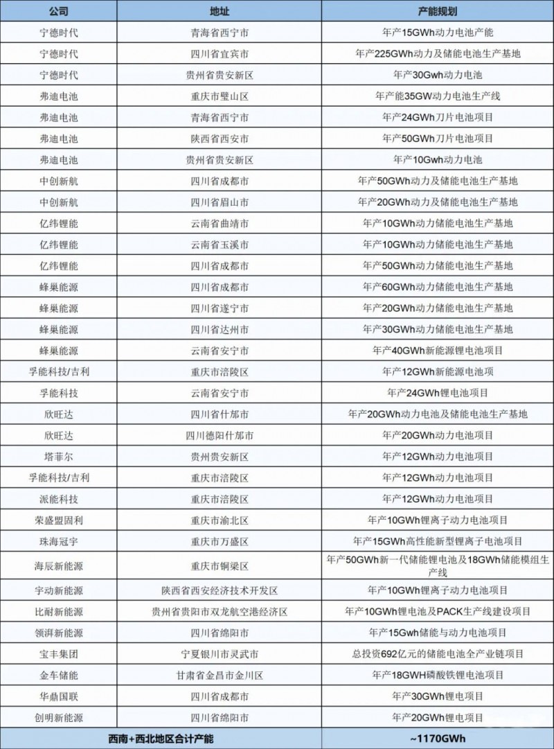 全國動(dòng)力與儲(chǔ)能電池基地產(chǎn)能統(tǒng)計(jì)表4---西南+西北地區(qū)