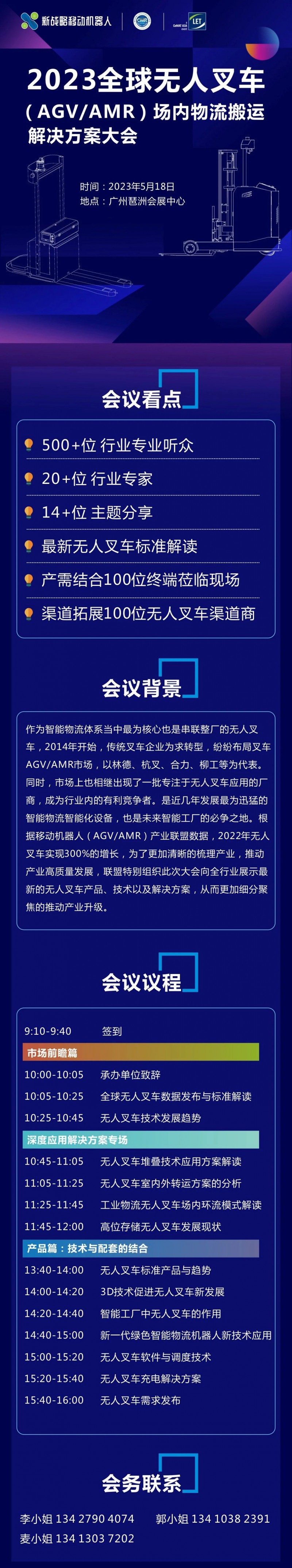 從上表可以看出,資本對于無人叉車市場的關注逐年上升,投入金額也在逐年加大。作為近幾年發展最為迅猛的移動機器人細分品類之一,無人叉車未來應用空間還十分廣闊,為了更加清晰地梳理產業,推動產業高質量發展,5月18日,由CMR聯盟主辦的“2023全球無人叉車(AGV/AMR)廠內物流搬運解決方案大會”將重磅開啟,敬請期待!