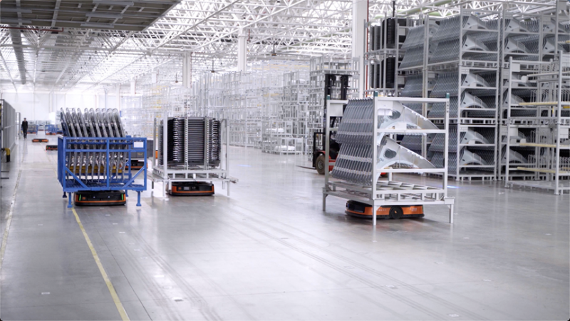 在焊裝車間,中零散的車體進入下一站焊接車間,移動機器人支持側圍等超長、異型載具搬運,在焊裝車間空間緊湊的情況下實現多級緩存,復雜空滿交換,柔性滿足產線上需求。