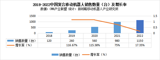 根據(jù)CMR產(chǎn)業(yè)聯(lián)盟數(shù)據(jù),新戰(zhàn)略移動(dòng)機(jī)器人產(chǎn)業(yè)研究所統(tǒng)計(jì), 2022年度中國(guó)市場(chǎng)新增復(fù)合移動(dòng)機(jī)器人1150臺(tái),從2018年的120臺(tái)到2022超千臺(tái),近年來(lái)復(fù)合機(jī)器人落地應(yīng)用逐漸增多。