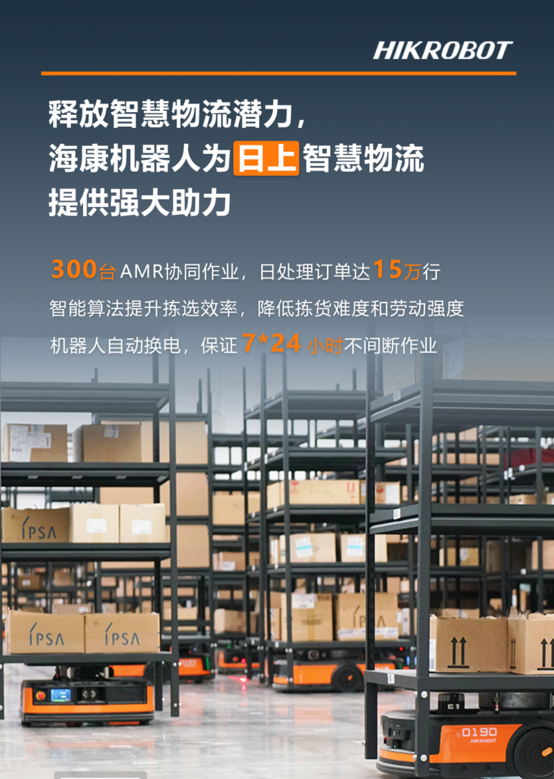 早在2020年,日上便攜手海康機器人共同開啟了智慧物流創新合作,超300余臺柔性智能的海康機器人AMR及3臺自動換電站已成功落地日上免稅行保稅區外新倉,基于前期項目的良好合作基礎,日上決定將成功經驗賦能至更多倉庫,提升揀選效率的同時,降低員工的揀貨難度和勞動強度,創造了更友好和安全的工作條件。