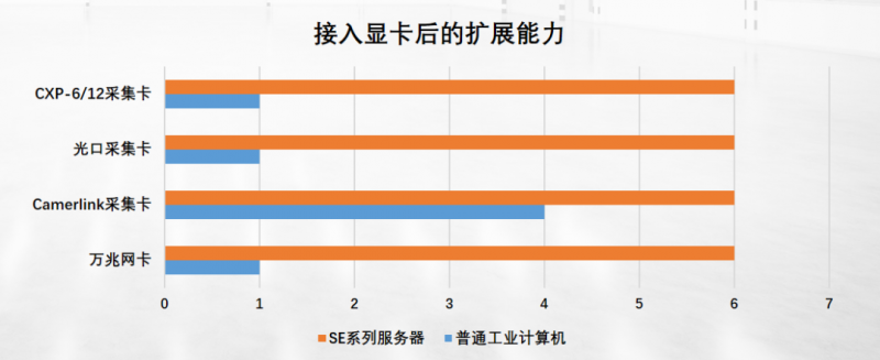 應(yīng)對需要同時處理多張采集卡數(shù)據(jù)的應(yīng)用時,由于傳統(tǒng)工控機(jī)自身擴(kuò)展槽數(shù)量和顯卡厚度等因素限制,未能滿足需要的擴(kuò)展性能;而SE系列服務(wù)器其特有的多卡插槽特性和獨(dú)特槽位設(shè)計,能夠在規(guī)避顯卡遮擋的同時提供至多擴(kuò)展6個PCIex8卡槽的采集卡。