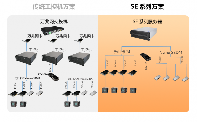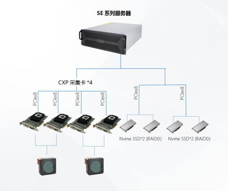SE系列布置簡單、靈活,調(diào)試更便捷;一臺設(shè)備集多卡擴(kuò)展、高速處理、高速存儲3合1,更省空間;搭配專業(yè)PCIe接口存儲設(shè)備,輕松實(shí)現(xiàn)高速存圖需求。