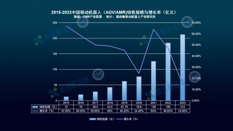 圖表:2015-2023中國工業(yè)應(yīng)用移動機(jī)器人(AGV/AMR)銷售規(guī)模與增長率