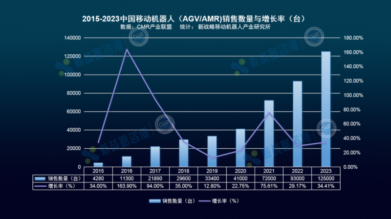 根據(jù)CMR產(chǎn)業(yè)聯(lián)盟數(shù)據(jù),新戰(zhàn)略移動機(jī)器人產(chǎn)業(yè)研究所統(tǒng)計,從2015年至2023年,中國市場移動機(jī)器人(AGV/AMR)產(chǎn)業(yè)年復(fù)合增長率達(dá)43.18% ;2023年中國移動機(jī)器人(AGV/AMR)銷售規(guī)模約為212億,同比增長14.59%;銷售數(shù)量約為125000臺,同比增長34.41%。