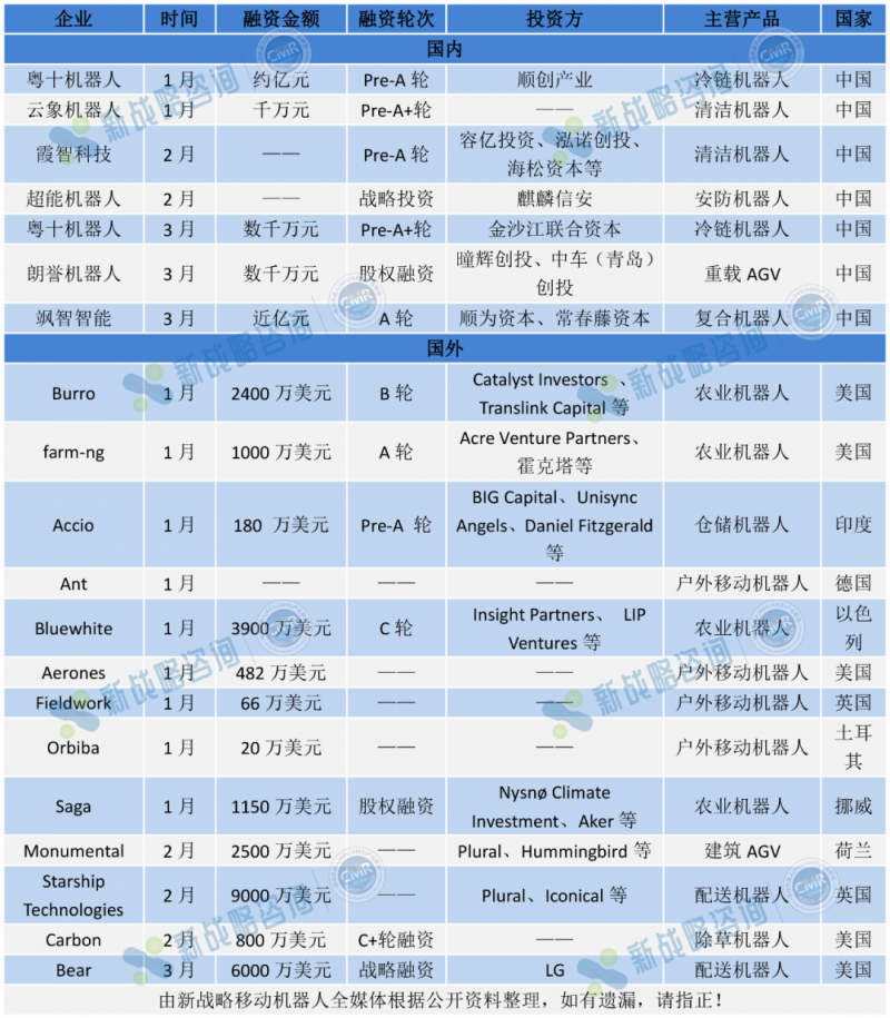 從時間分布來看,Q1全球移動機器人融資事件發生集中在1月,融資事件11起,融資總額約7.7億元;2月出現較多大筆融資,融資事件5起,資金總額約9.1億元;3月融資數量和融資金額均有所回落,融資數量4起,融資總額約5.5億元。