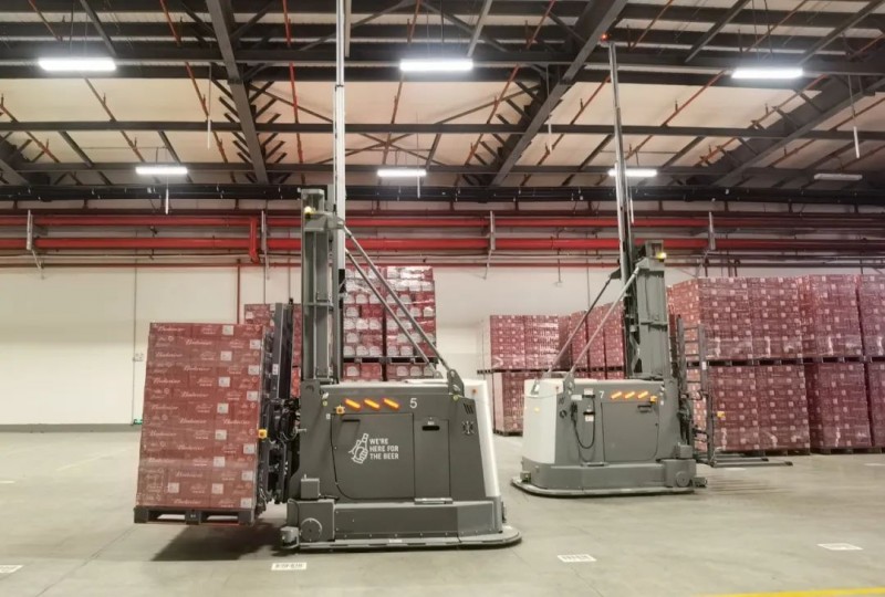 百威項目采用今天國際13臺AGV小車,包括9臺雙工位平衡重叉取式AGV,4臺四工位背輥式全向AGV小車兩種車型。四工位背輥式全向AGV用于成品啤酒下線,完成成品入庫搬運。雙工位平衡重叉取式AGV小車把輸送機站臺的成品搬運到潮汐存放倉庫,采用密集地堆方式存放。在AGV收到備貨指令時,把產品從潮汐倉庫或者立庫出庫成品搬運到備貨區域。實現了生產線上生產出成品啤酒無人化精準搬運入庫,再到從倉庫出貨到備貨區搬運。