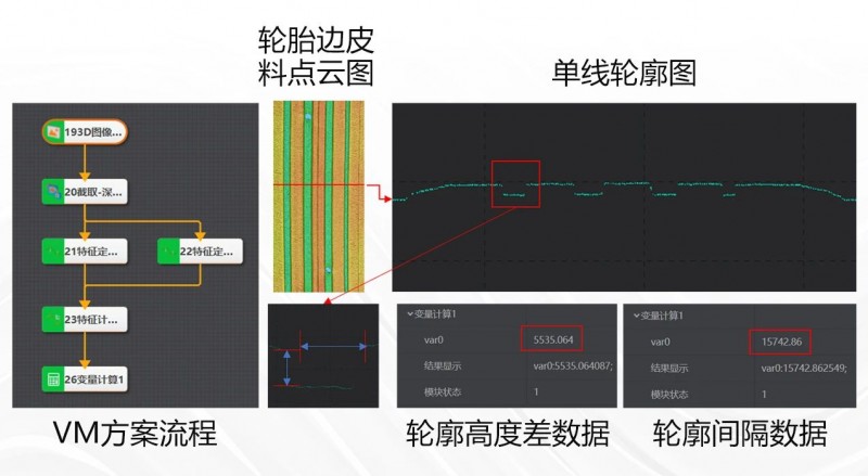 下圖展示了3D激光輪廓傳感器對輪胎胎毛的實際采集效果及VM檢測方案。