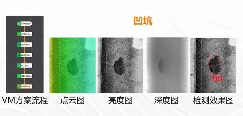 3D激光輪廓傳感器可有效識別缺陷、同時滿足生產節拍要求,完成全面檢測僅需旋轉一周。如下展示了鼓包、凹坑的實際測試圖像。