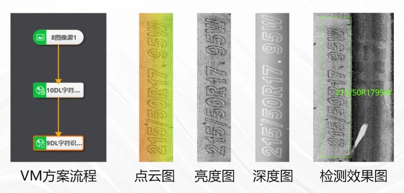 采用3D激光輪廓傳感器進行圖像采集,結合??禉C器人AI訓練平臺,進行字符識別,可準確識別輪胎所有DOT碼。