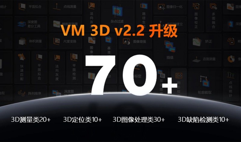 VM 3D算法平臺(tái)迎來(lái)V2.2版本的重大升級(jí)!新版本3D算子陣容實(shí)現(xiàn)全面升級(jí),功能更加強(qiáng)大,從原有的50個(gè)躍升至70+,全面覆蓋3D測(cè)量、定位、圖像處理及缺陷檢測(cè)等關(guān)鍵模塊,為用戶(hù)提供更加強(qiáng)大且全面的基礎(chǔ)功能支持。此次更新進(jìn)一步增強(qiáng)了算法平臺(tái)的性能與靈活性,面對(duì)復(fù)雜3D視覺(jué)應(yīng)用更加得心應(yīng)手。