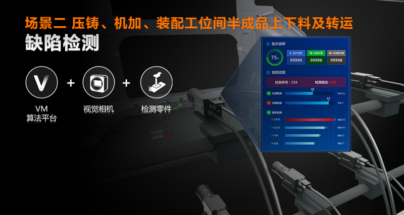 ??禉C器人利用工業相機,并通過VM算法平臺,實現高效缺陷檢出。對于壓鑄件,能夠檢測出凸起、缺料、多料、裂紋和碰劃傷等缺陷;在機加和裝配環節,檢測內容包括孔洞有無、通孔是否打通、螺紋孔質量、預鑄孔加工面和倒角等。