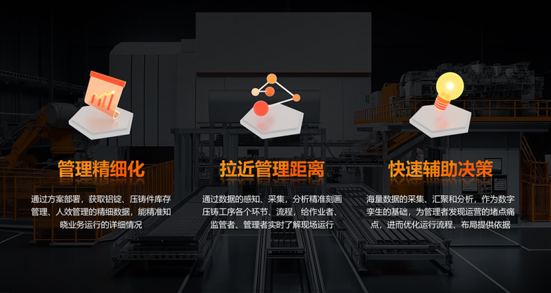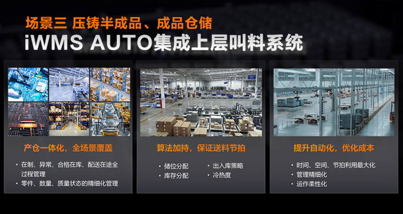 該方案把一體化壓鑄按照物料形態和工序分成三個場景,鋁錠收貨存儲及上線;壓鑄、機加、裝配工位間半成品上下料及轉運;壓鑄半成品、成品倉儲三個場景,實現運營精細化管理、拉進管理者距離、為優化作業流程提供輔助決策依據。