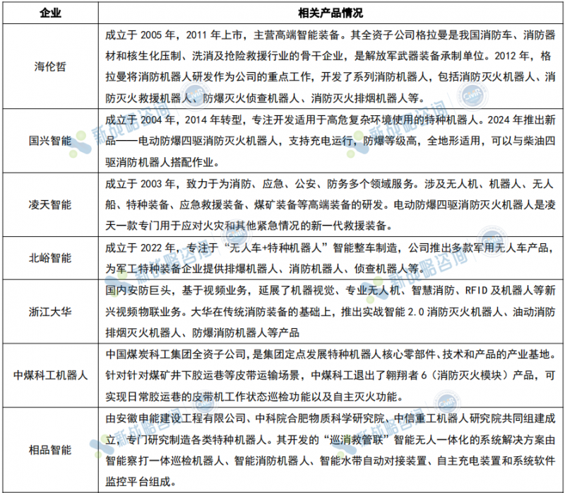 為滿足市場(chǎng)需求,國(guó)內(nèi)外眾多企業(yè)都在積極研發(fā)和推廣更加先進(jìn)、高效的消防機(jī)器人產(chǎn)品,以滿足市場(chǎng)需求。這些企業(yè)在技術(shù)研發(fā)、產(chǎn)品創(chuàng)新、市場(chǎng)拓展等方面展開激烈競(jìng)爭(zhēng),不斷推出具有自主知識(shí)產(chǎn)權(quán)和核心競(jìng)爭(zhēng)力的消防機(jī)器人產(chǎn)品。圖表:中國(guó)市場(chǎng)部分消防機(jī)器人企業(yè)