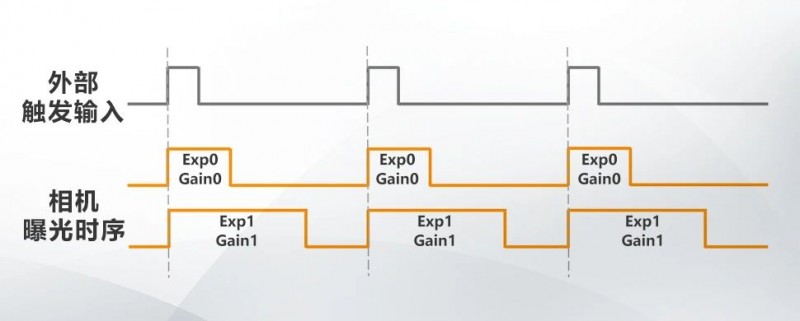 相機支持多重曝光功能(Multi Exposure),可支持自定義設(shè)置2組曝光時間及增益,適用于明暗場的檢測場景。