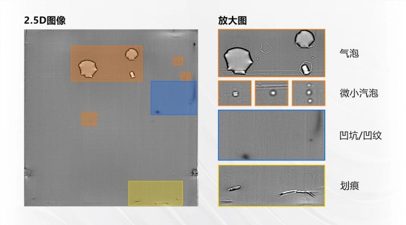 識別難點:電池表面覆膜,缺陷和背景的對比度很低,難以突出缺陷;尤其是細小氣泡褶皺,幾乎在2D圖像中無灰度差