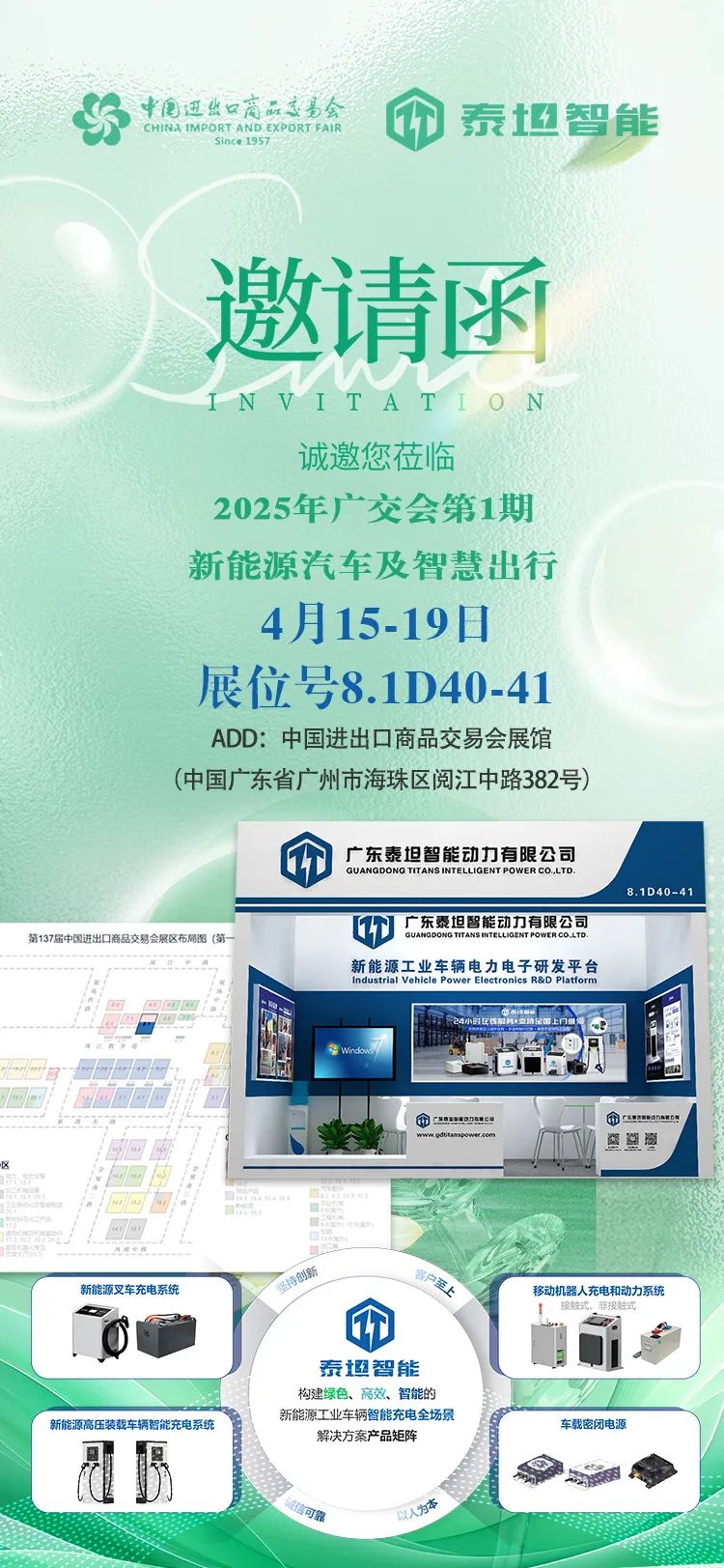 您好!泰坦智能誠摯邀請您參加第137屆中國進(jìn)出口商品交易會,展會時間是4月15日至19日(第一期),我們的展位號是8.1D40-41。