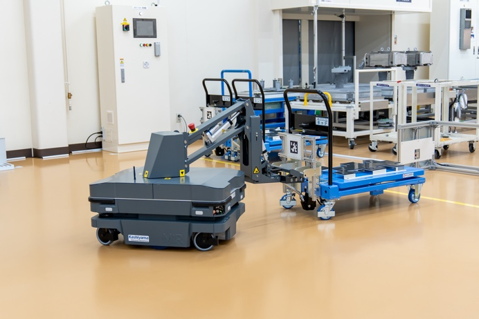 在日本樫山工業株式會社,工廠擴建后運輸距離大幅增加,傳統的自動導向車 (AGV) 難以滿足高效的內部物流需求。MiR250 Hook 憑借模塊化設計與智能調度系統,成為破解物流難題的關鍵。其搭載的激光 SLAM 導航技術,能實時構建工廠地圖并動態規劃最優路徑,即使在狹窄通道與交叉路口也能實現毫米級精準避障。通過與工廠 MES 系統深度集成,MiR250 Hook 根據生產節拍自動響應物料需求,減少傳統人工搬運中因視線盲區、操作失誤導致的工傷隱患,成為柔性物流體系中兼具效率與安全的 “萬能適配器”。?