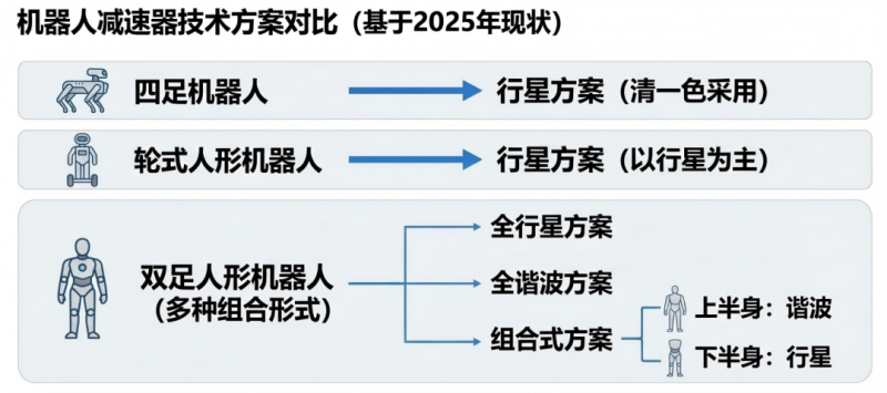 從實(shí)際出貨結(jié)構(gòu)來(lái)看,不同機(jī)器人形態(tài)對(duì)關(guān)節(jié)方案的選擇已經(jīng)出現(xiàn)分化。四足機(jī)器人幾乎清一色采用行星方案;輪式人形機(jī)器人同樣以行星為主;在雙足人形上,則存在多種組合形式——有的采用行星方案,有的采用諧波方案,有的在上半身使用諧波、下半身使用行星。相比之下,RV減速器由于傳動(dòng)效率偏低、發(fā)熱問(wèn)題突出,目前并未發(fā)現(xiàn)在人形機(jī)器人上有成熟的方案。