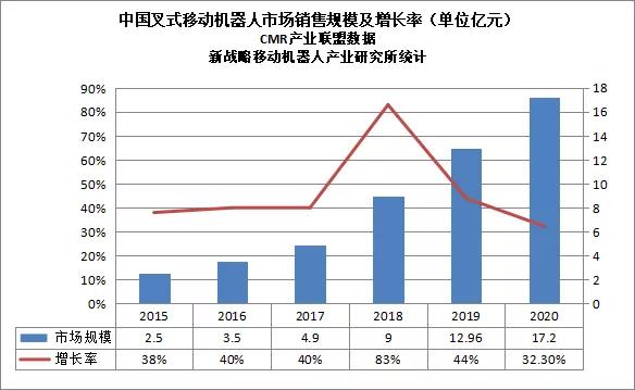 圖表1:2015-2020中國(guó)叉式移動(dòng)機(jī)器人市場(chǎng)銷售規(guī)模及增長(zhǎng)率(單位億元)