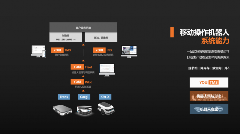優艾智合是國內最早布局軟件系統的移動機器人企業。以針對制造業打造的YOUI TMS智慧物流系統為例,其能將移動機器人在工序間的物理流轉升級為數據連接,具備根據ERP、WMS、MES等企業信息系統進行整體物流自主調度的能力,完成備料倉到產線再至成品倉的物流數據全覆蓋。