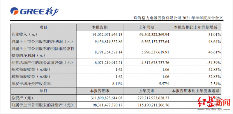 根據(jù)格力電器發(fā)布其2021年上半年財報顯示,2021年上半年,格力實現(xiàn)營收911億元,同比增長31%。主營收入為709.32億元,同比增長42.69%。利潤總額 109.76億元,42.62%;實現(xiàn)歸屬于上市公司股東的凈利潤94.57億元,同比增長48.64%。基本每股收益1.62元,同比增長52.83%。其中,2021上半年格力智能裝備收入為1.98億元,同比減少5.44%,占比總營收 0.22%。