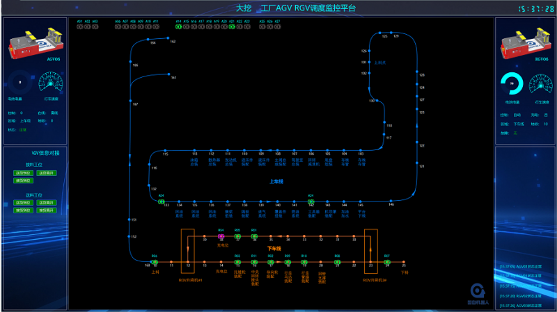大挖工廠使用國自20噸重載AGV+30噸RGV,串聯起產線裝配工位,實現上線、下線全程智能化調度。
