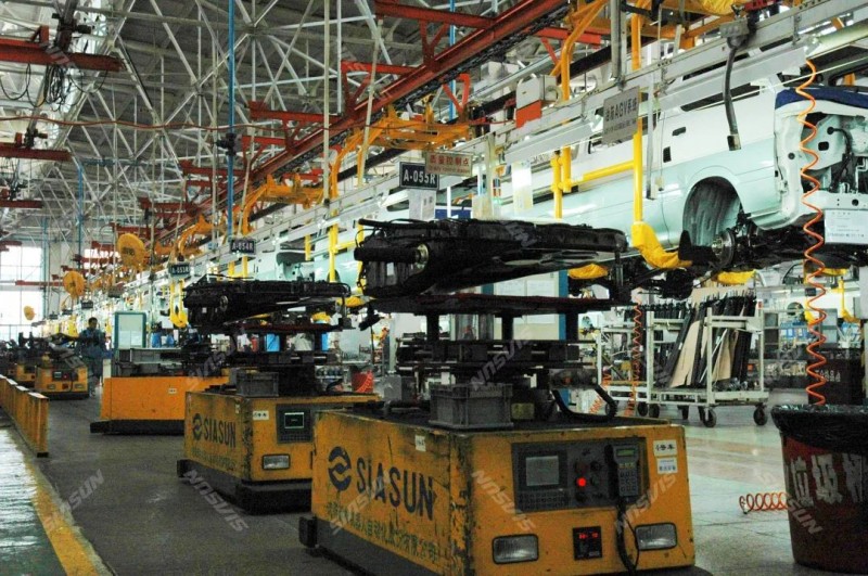 2007年新松與美國(guó)通用汽車合作,為其提供47臺(tái)AGV設(shè)備。該項(xiàng)目使用了新松自主研發(fā)的同步跟蹤技術(shù),可動(dòng)態(tài)跟蹤車身吊具無(wú)源反光板,通過檢測(cè)相對(duì)位置差,實(shí)現(xiàn)動(dòng)態(tài)裝配。同時(shí),項(xiàng)目采用了升降機(jī)同步系統(tǒng),通過與信息系統(tǒng)的聯(lián)動(dòng),AGV開機(jī)后即可將升降機(jī)高度調(diào)整至合適位置,提高作業(yè)效率。另外,項(xiàng)目停車點(diǎn)增加了RFID認(rèn)證功能,AGV可自動(dòng)讀取站點(diǎn)信息,提高系統(tǒng)可靠性。