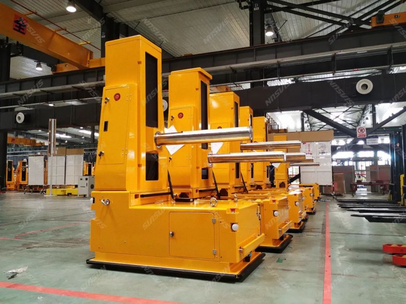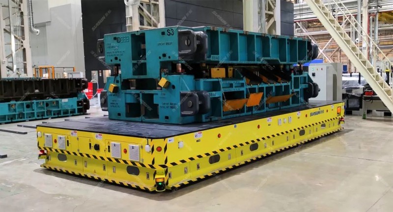 亮點(diǎn):此項(xiàng)目中,為了適應(yīng)生產(chǎn)工藝,AGV被設(shè)計(jì)成兩身段結(jié)構(gòu),由主動(dòng)力部分帶動(dòng)一個(gè)附屬托架的形式。分段式結(jié)構(gòu)可有效解決長(zhǎng)車身結(jié)構(gòu)在轉(zhuǎn)彎時(shí)的問題,實(shí)現(xiàn)小轉(zhuǎn)彎半徑運(yùn)行,更加靈活,節(jié)省運(yùn)行時(shí)的占地面積。同時(shí),為了適應(yīng)發(fā)動(dòng)機(jī)的構(gòu)造,全新設(shè)計(jì)了托架部分,即使在急停等特殊情況下,AGV承載的發(fā)動(dòng)機(jī)也不會(huì)跌落。