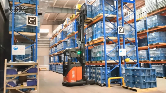 未來機器人前移式無人叉車最大舉升為9.4米,叉臂根部安裝了感知模塊,可以對橫梁狀況、庫位占用情況進行安全檢測,為后續(xù)入庫作業(yè)提供信息輸入。且具備自適應(yīng)模塊,可以很好地滿足多次重復(fù)精準叉取需求,提高作業(yè)的安全系數(shù)。同時其機器人管理系統(tǒng)可以對接自動門,當(dāng)無人叉車行駛到卷閘門附近時,系統(tǒng)提前發(fā)出指令到卷閘門,節(jié)省了人工操作的時間,保障物流通暢。