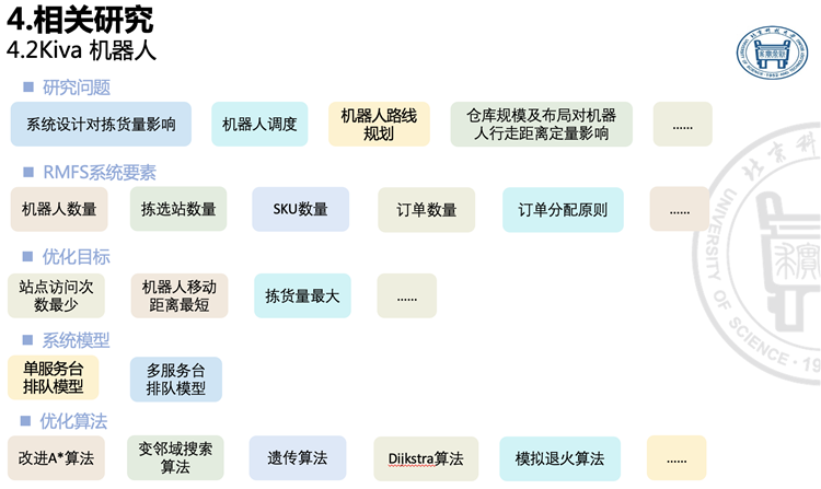 此外,趙寧教授介紹到,真正的物流仿真還涉及很多方面:如系統(tǒng)設(shè)計(jì)對(duì)揀貨量影響、機(jī)器人調(diào)度、機(jī)器人路線(xiàn)規(guī)劃、倉(cāng)庫(kù)規(guī)模及布局對(duì)機(jī)器人行走距離定量影響;RMFS系統(tǒng)要素如機(jī)器人數(shù)量、揀選站數(shù)量、SKU數(shù)量、訂單數(shù)量、訂單分配原則;優(yōu)化目標(biāo)如站點(diǎn)訪(fǎng)問(wèn)次數(shù)最少、機(jī)器人移動(dòng)距離最短、揀貨量最大;系統(tǒng)模型單服務(wù)臺(tái)排隊(duì)模型、多服務(wù)合排隊(duì)模型;優(yōu)化算法如改進(jìn)A*算法、變鄰域搜索、遺傳算法、Diikstra算法、模擬退火算法等。