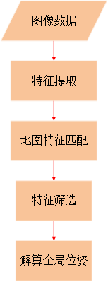 紋理導(dǎo)航算法首先對(duì)相機(jī)采集的圖像進(jìn)行視覺(jué)特征提取,這里的視覺(jué)特征主要指點(diǎn)、線及結(jié)構(gòu)特征等;然后,算法會(huì)將提取得到的特征與導(dǎo)航地圖庫(kù)中的特征進(jìn)行匹配、篩選,得到地圖庫(kù)中對(duì)應(yīng)的匹配特征,根據(jù)兩對(duì)特征的相互映射、轉(zhuǎn)換關(guān)系解算實(shí)時(shí)全局位姿,完成AGV設(shè)備的導(dǎo)航定位。