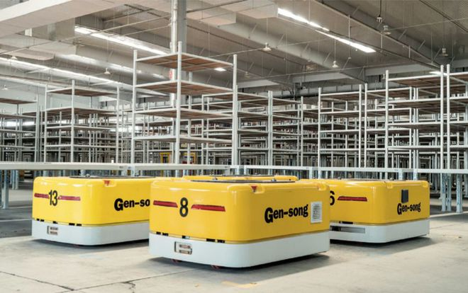 合肥井松為上汽通用東岳打造的倉(cāng)儲(chǔ)項(xiàng)目,整個(gè)倉(cāng)庫(kù)共有貨架956個(gè),每個(gè)貨架5層,可以存放料箱34416個(gè),貨物種類(lèi)與吞吐流量極為龐大。井松為倉(cāng)庫(kù)布置了21臺(tái)視覺(jué)紋理導(dǎo)航機(jī)器人來(lái)實(shí)現(xiàn)整個(gè)倉(cāng)庫(kù)的自動(dòng)化搬運(yùn),通過(guò)中央調(diào)度系統(tǒng)進(jìn)行智能分析,合理調(diào)配每一臺(tái)機(jī)器人完成各種物料的進(jìn)出。