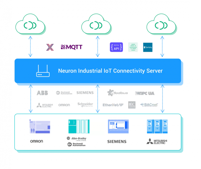 Neuron 為工業物聯網的「連接」而生,支持同時為多個不同通訊協議設備、數十種工業協議進行一站式接入及 MQTT 協議轉換,僅占用超低資源,可以原生或容器的方式部署在 X86、ARM 等架構的各類邊緣硬件中,助力構建工業物聯網平臺與應用。